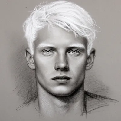 SketchSensitive charcoal portrait avatar of a striking man with albinism, featuring delicate white-blonde features and nuanced grayscale artistic rendering.