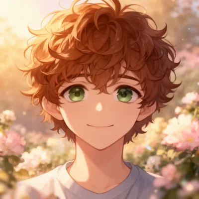 AnimeGentle anime-style portrait of a young male character with warm chestnut curls, emerald eyes, and a tender smile set against a dreamy garden background.