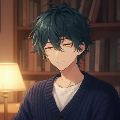 Soft anime-style profile picture featuring a tranquil male character with teal hair, golden eyes, and a cozy navy cardigan, perfect for gentle aesthetic profiles.