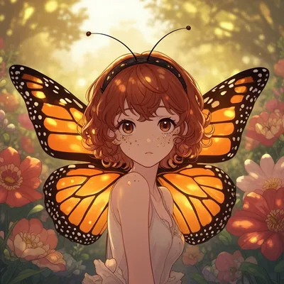 AnimeEnchanting anime-style AI avatar featuring a whimsical butterfly fairy with golden freckles, monarch wings, and auburn hair in a vibrant flower garden scene.
