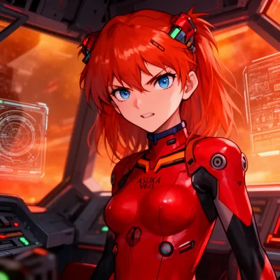 AnimeHigh-quality AI-generated anime avatar featuring a fierce red-haired female character in a plugsuit with intense blue eyes and sci-fi background.