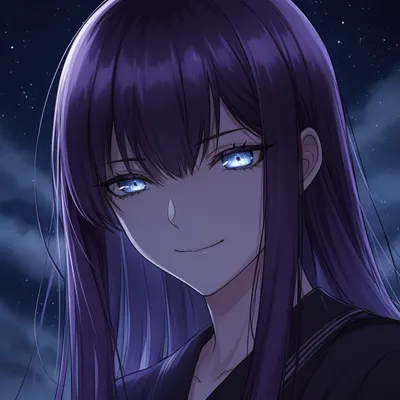 Enchanting anime avatar featuring a mysterious girl with dark violet hair and piercing blue eyes, capturing ethereal moonlight atmosphere with dramatic starry background.