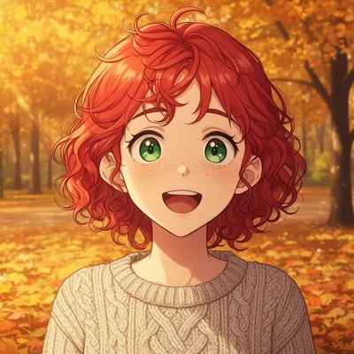 AnimeWarm slice of life anime avatar featuring a charming redhead with freckles in a cozy knitted sweater, set against a golden autumn park background.