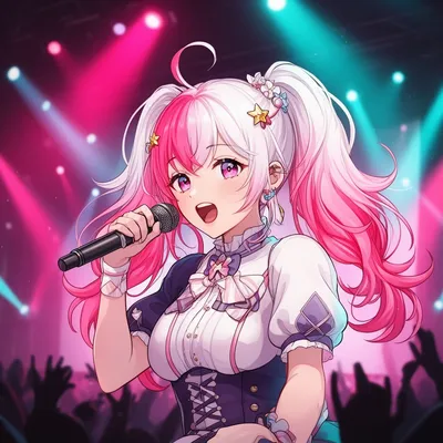 AnimeDynamic anime-style avatar of a twin-tailed idol singer with gradient pink hair, performing on a colorful concert stage with star hair clips.