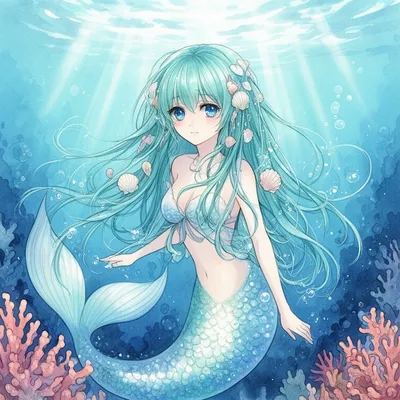 AnimeEnchanting watercolor anime mermaid avatar with turquoise hair, blue eyes, and pearlescent tail. Perfect digital profile image with underwater fantasy style.