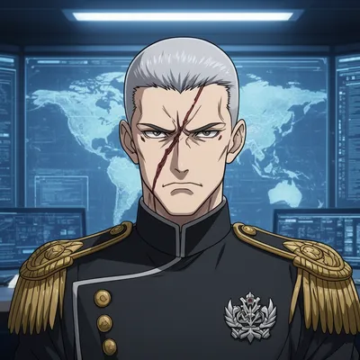 Intense anime-style AI avatar of a stern military leader with silver hair, battle scar, and tactical dark uniform against holographic war room backdrop.