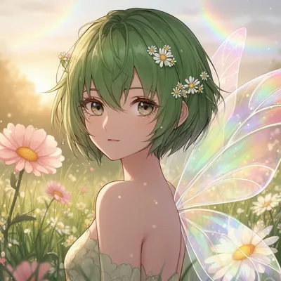 AnimeMagical anime-style avatar featuring a delicate fairy with green pixie hair, iridescent wings, and soft morning light in an ethereal meadow setting.