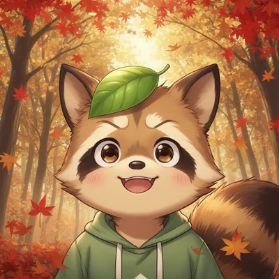 AnimeWhimsical anime-style avatar of a tanuki character with raccoon ears, fluffy tail, and mischievous grin set in a golden autumn forest scene.