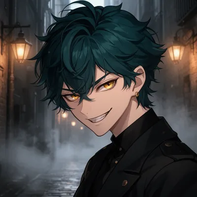AnimeStylish anime character avatar with dark teal hair, golden cat eyes, and mischievous expression perfect for profile pictures and digital personas.