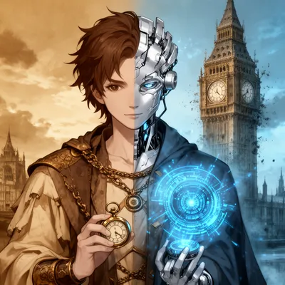 Unique anime-style AI avatar featuring a half-ancient, half-futuristic character blending temporal aesthetics with dynamic cybernetic design and dimensional elements.