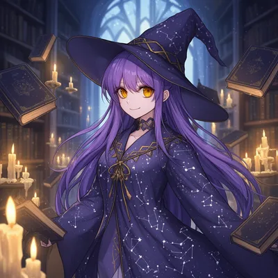 Enchanting anime-style avatar of a mystical witch with purple hair, amber eyes, and starry magical robe against a celestial library background.