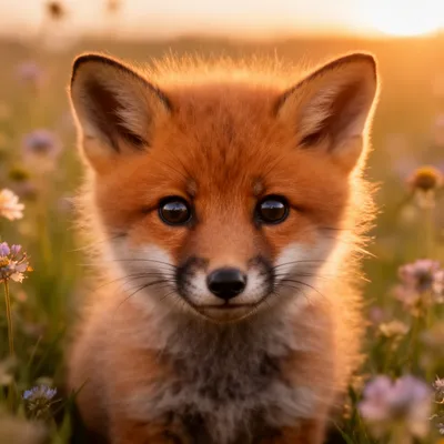 Heartwarming wildlife AI avatar featuring a cute baby fox with fluffy orange fur, innocent dark eyes, and golden sunset background perfect for profile images.
