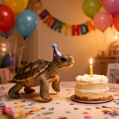 Adorable AI-generated avatar featuring a baby turtle in a tiny party hat, marching toward a birthday cake with irresistible celebration spirit and charm.