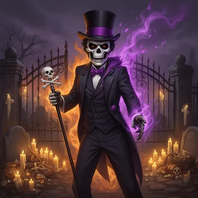 MythicalPowerful mystical AI avatar inspired by Baron Samedi, featuring intense dark eyes, skull face paint, top hat, and supernatural crossroads spirit aesthetic.