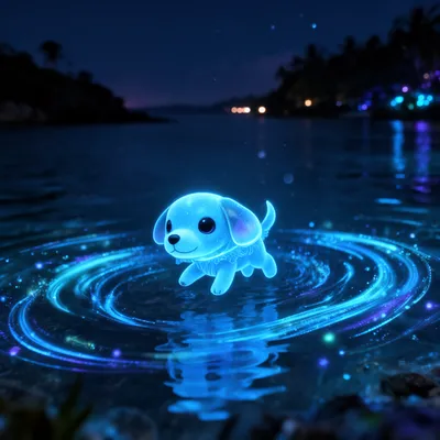 MonstersEnchanting AI-generated avatar featuring a tiny phosphorescent jellyfish puppy swimming through a vibrant electric blue bioluminescent seascape with ethereal light patterns.