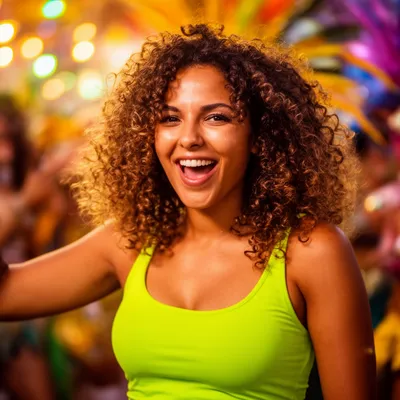 RealisticVibrant AI-generated avatar of a young Brazilian woman with curly hair, capturing the joyful energy of Rio Carnival with warm, colorful lighting and dynamic style.