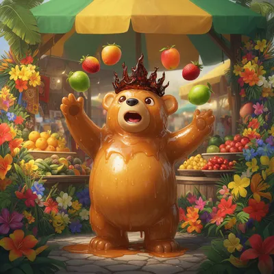 Playful AI-generated monster avatar featuring a wobbling caramel bear juggling tropical fruits with a burnt-sugar crown in a vibrant Brazilian market scene.