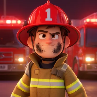 Vibrant Pixar-style cartoon avatar of a brave firefighter with bold red helmet, heroic stance, and dramatic emergency lighting, perfect for professional profiles.