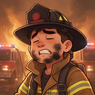 CartoonDynamic cartoon avatar of a brave young firefighter with a triumphant expression, featuring realistic details like soot and emergency scene lighting for a powerful profile image.