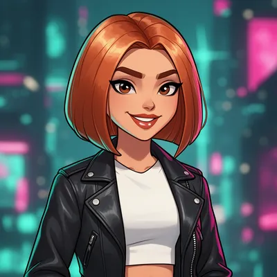Vibrant AI-generated cartoon avatar featuring a confident young woman with sleek copper hair, leather jacket, and neon city-inspired design perfect for digital profiles.