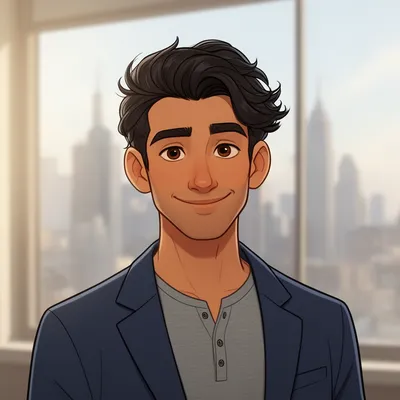 CartoonStylish cartoon avatar of a handsome man with wavy dark hair, olive skin, and warm brown eyes in a sophisticated navy blazer illustration.