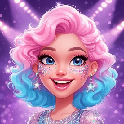 Dazzling cartoon-style AI avatar of a bubbly pop star with pink and blue ombré hair, glittery makeup, and sparkling stage presence perfect for digital profiles.