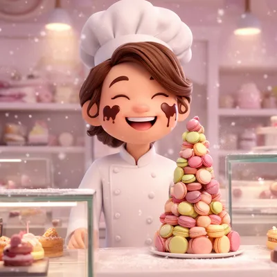 3D RenderWhimsical 3D render of a smiling pastry chef with chocolate-dusted cheeks, wearing a crisp white jacket and surrounded by floating powdered sugar.