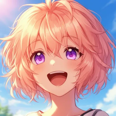 AnimeAdorable anime-style avatar featuring a cheerful girl with peach-pink hair and violet eyes, capturing a joyful summer moment with warm sunlight and bright background.