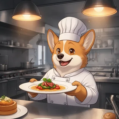 Charming anthropomorphic furry avatar featuring a playful corgi chef in professional kitchen attire, perfect for culinary and character design enthusiasts.