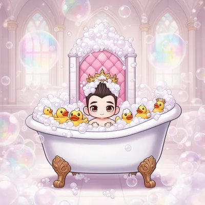 ChibiPlayful chibi-style AI avatar featuring a tiny royal character in a whimsical bubble bath scene with soap crown and rubber duck companions.