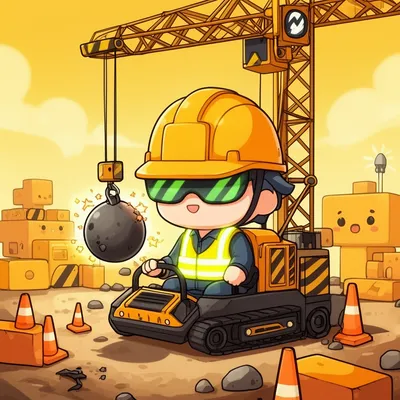 ChibiPlayful chibi style AI avatar featuring a tiny construction worker with neon safety vest, hard hat, and adorable crane scene with cartoon impact stars.