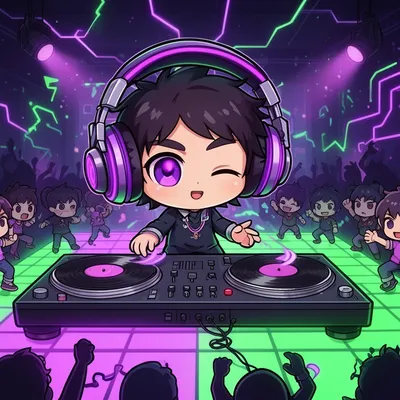 ChibiSuper-deformed anime-style chibi avatar of a playful DJ with oversized headphones, spinning records on a vibrant neon dance floor with electric purple and green colors.