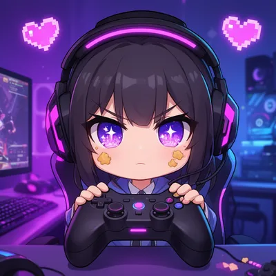 ChibiAdorable chibi-style gamer girl avatar with sparkling eyes, oversized headset, and pixel gaming aesthetic. Playful digital character perfect for streaming and online personas.