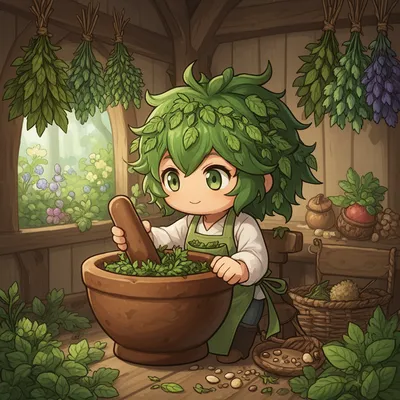 ChibiAdorable miniature chibi herbalist avatar with wild green hair, grinding herbs in a whimsical woodland cottage scene with earthy green color palette.