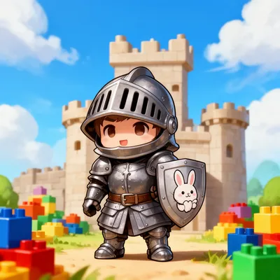ChibiAdorable miniature knight chibi avatar in oversized armor with a charming bunny shield, standing playfully against a colorful building block castle background.