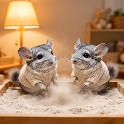 PetsAdorable AI-generated avatar featuring two playful chinchillas in matching sweaters, sharing a cozy dust bath with soft silver fur and joyful expressions.