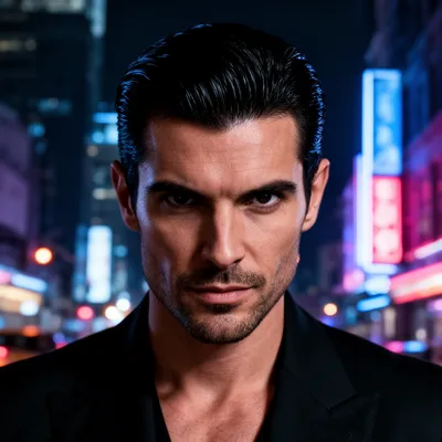 RealisticDramatic realistic male AI avatar with slicked black hair, intense dark eyes, and angular facial features against a neon city nightscape backdrop.