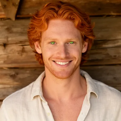 RealisticPhotorealistic AI-generated avatar of a handsome man with wavy copper hair, bright green eyes, and a warm casual smile against a rustic wooden background.