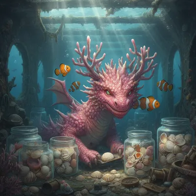 MonstersStunning AI avatar featuring a whimsical coral reef dragon with anemone horns, surrounded by clownfish in a mystical underwater workshop scene.