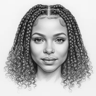 Artistic graphite sketch avatar featuring intricate cornrow hairstyle with textural transition to natural curls, meticulously rendered on smooth drawing paper.