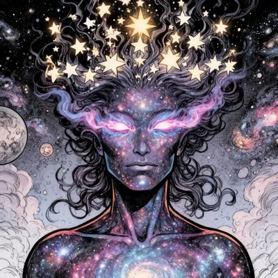 Comic BookStunning AI-generated comic book avatar featuring a celestial being with galaxy skin, nebula eyes, and a star-studded cosmic presence revealing universal wisdom.