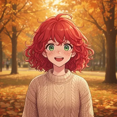 Delightful AI-generated anime profile picture featuring a sweet red-haired girl in a knitted sweater with warm autumn park background and soft golden lighting.