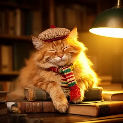 Charming AI-generated avatar of a fluffy orange tabby cat in a stylish beret, nestled among vintage books with warm, dreamy lighting.