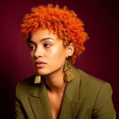 RealisticArtistic AI-generated portrait of a young woman with vibrant orange natural hair, brass earrings, and olive blazer against a warm burgundy backdrop.