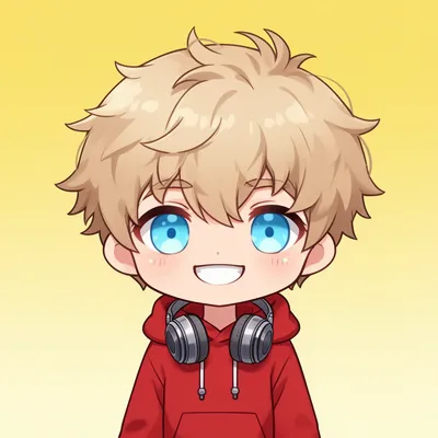 ChibiAdorable chibi-style digital avatar featuring a sandy blonde boy with sky blue eyes, wearing a red hoodie and headphones, perfect for online profiles.