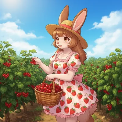 Charming anthropomorphic bunny girl avatar in strawberry sundress, picking berries in sunny farm field. Cute furry character art style for profile images.