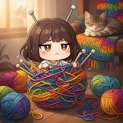 ChibiWhimsical chibi-style AI avatar of a cute girl tangled in knitting, surrounded by colorful yarn with playful frustrated expression.