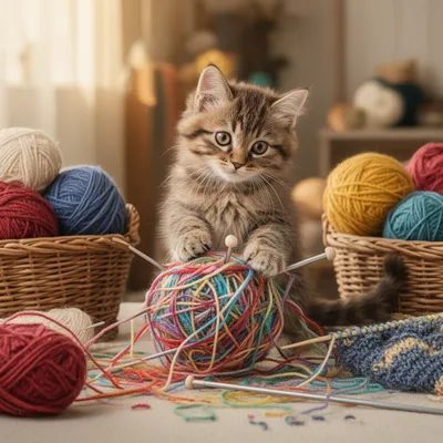 PetsAdorable monsters-style AI avatar featuring a whimsical kitten tangled in colorful yarn, perfect for creative crafting and knitting enthusiasts' profiles.
