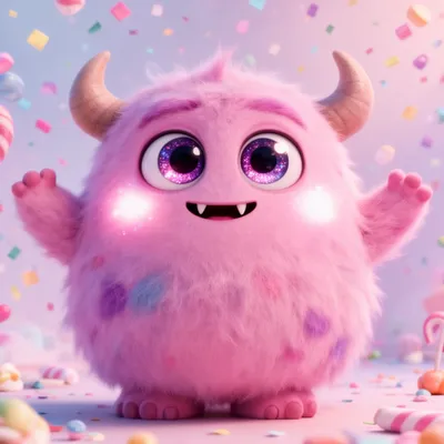 Charming AI-generated monster avatar with fluffy pink design, sparkly eyes, tiny fangs, and playful cartoon style perfect for digital profiles.