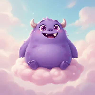 MonstersPlayful cartoon monster avatar with chubby purple design, sparkling eyes, tiny horns, and whimsical pastel cloud background for fun digital profiles.